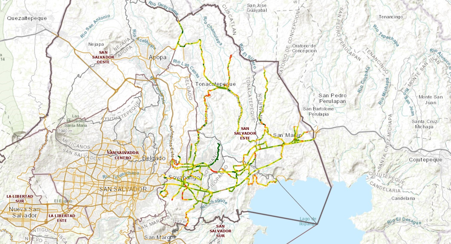 Description: Este mapa muestra la Red Vial Primaria del Área Metropolitana de San Salvador, brindando información sobre el porcentaje de pendientes de las vías de circulación en el municipio de San Salvador Este, específicamente en los Distritos de Soyapango, Ilopango, San Martín y Tonacatepeque, según el rango de porcentaje, así será la dificultad de la ruta de circulación en bicicleta, se clasifica en:0% Calle Plana1-3% Levemente Inclinada 4-5% Vía en Subida6-9% Pendiente Exigente10-14% Ciclista Experto15% ''Bajo Tu Propio Riesgo''Data que permite realizar análisis para las posibles propuestas de implementación de los sistemas de movilidad sostenible.