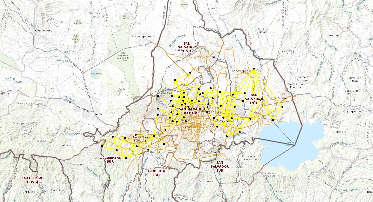 Description: Este mapa muestra las denominadas "líneas de deseo", que representan los desplazamientos frecuentes que realizan las personas en el ámbito laboral. Reflejan rutas preferidas o habituales que los trabajadores eligen para moverse entre su hogar y su lugar de trabajo, o entre diferentes ubicaciones relacionadas con sus tareas laborales, mayores a 1,500 viajes por día.
