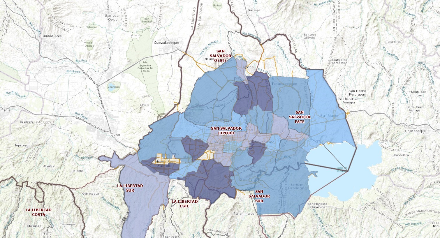 Description: Este mapa muestra las macrozonas del Área Metropolitana de San Salvador (AMSS), proporcionando información sobre la cantidad de viajes socioeconómicos asociados a los hogares de RENTA ALTA. En él se destacan las áreas donde se concentran las familias de ingresos económicos altos, lo que permite identificar las zonas con mayor presencia respecto a los viajes por renta alta del AMSS.