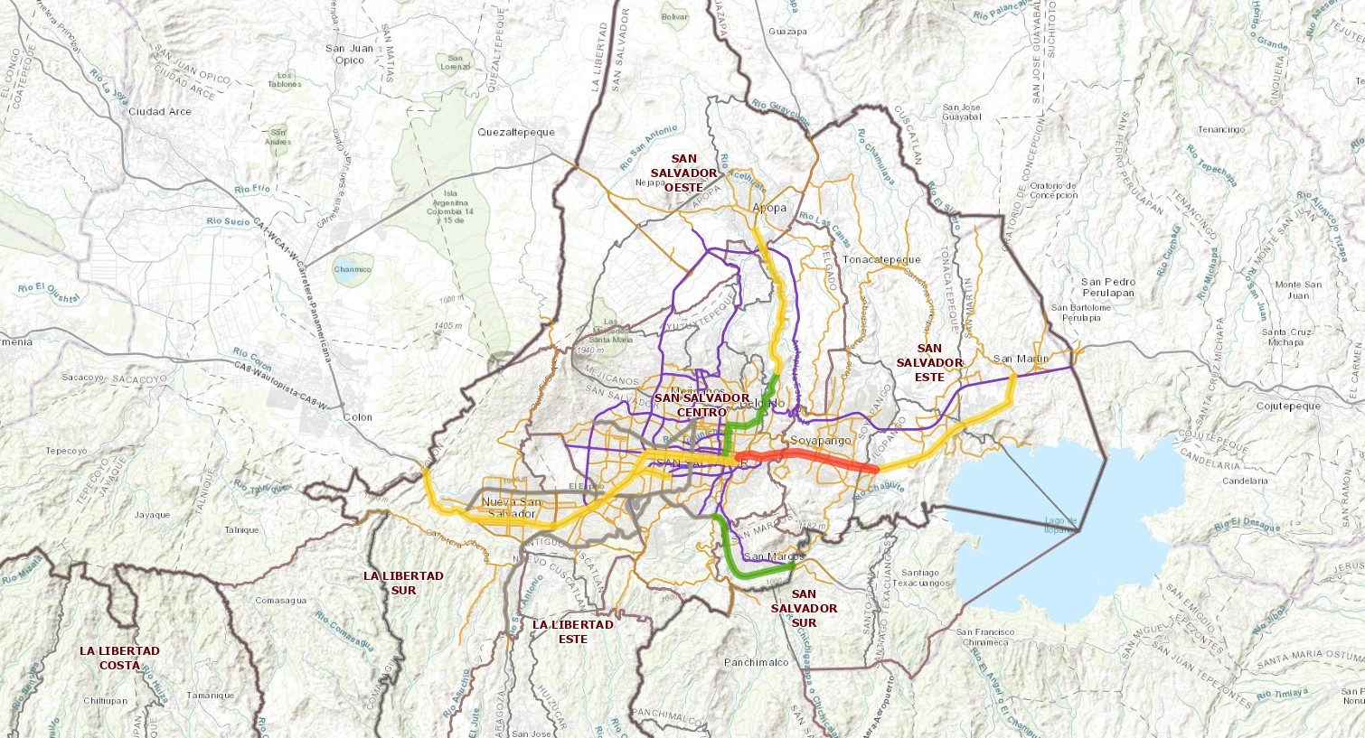 Description: El mapa muestra la cantidad de rutas de transporte público que circulan por la red principal de la Jerarquía Vial del Área Metropolitana de San Salvador (AMSS). Gráficamente, el grosor de las líneas varía según la cantidad de rutas que transitan por cada vía: las calles o avenidas, con más de 10 rutas se representan con un ancho menor, y este aumenta gradualmente hasta las vías con más de 50 rutas, que se muestran con el grosor más grueso.Esta representación visual permite identificar las vías más utilizadas por el transporte público, destacando los principales ejes de circulación y facilitando la comprensión de la distribución de las rutas en el área urbana.